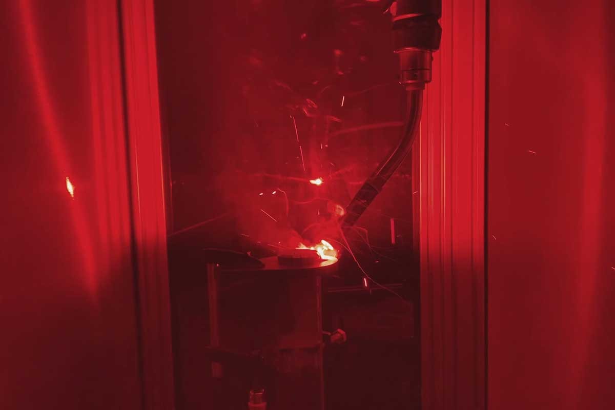 Ein Blick durch das Sicherheitsglas der Schweißroboterzelle EASY ARC der OTC DAIHEN EUROPE GmbH bei Engelmann Schweisstechnik: Ein schneller, sauberer und vor allem sicher eingebauter automatisierter Schweißvorgang mit perfektem Resultat, der nahezu ohne Schweißspritzer arbeitet und eine perfekte Schweißnaht hinterlässt.